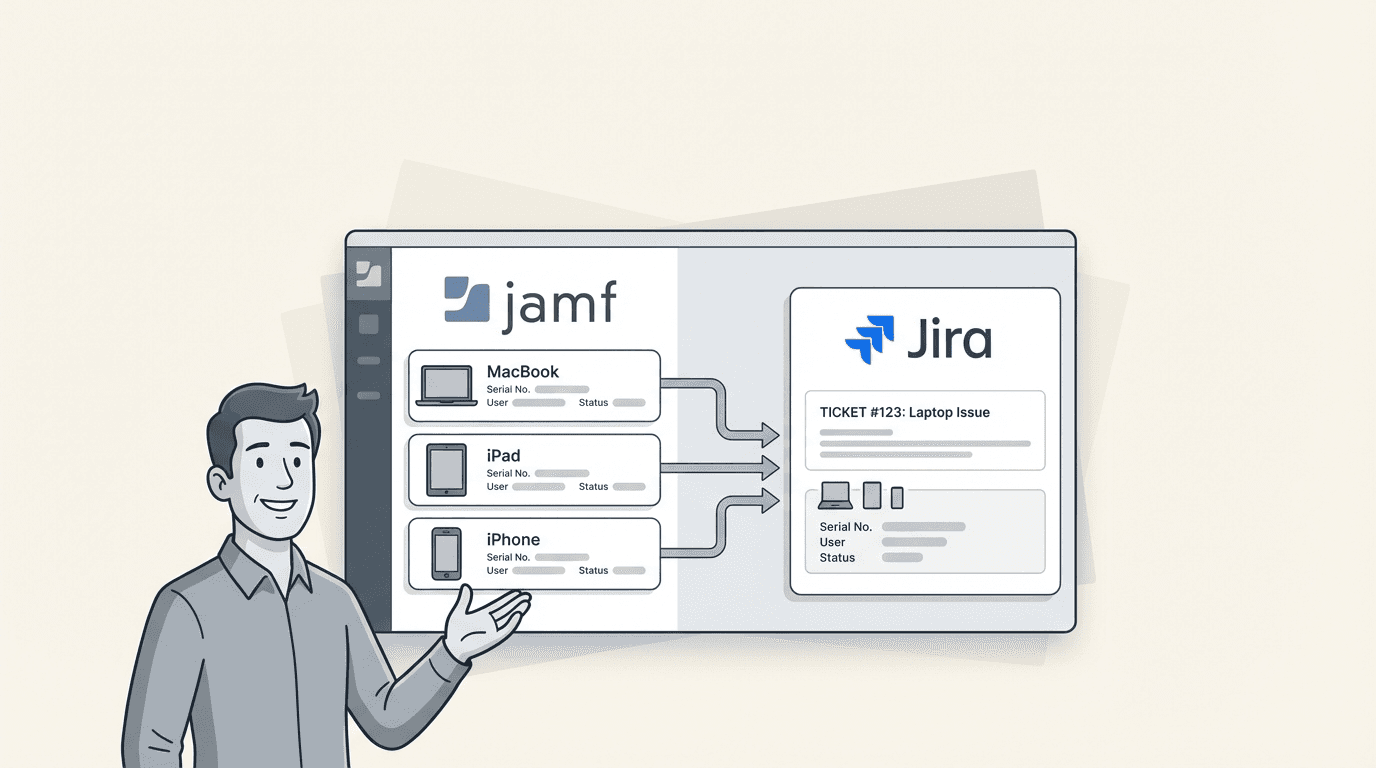 Without an integration, you're stuck with manual CSV exports, outdated spreadsheets, or asking users to read serial numbers over the phone. An Intune Jira integration automates this flow, pulling device data directly into your CMDB or asset management system.